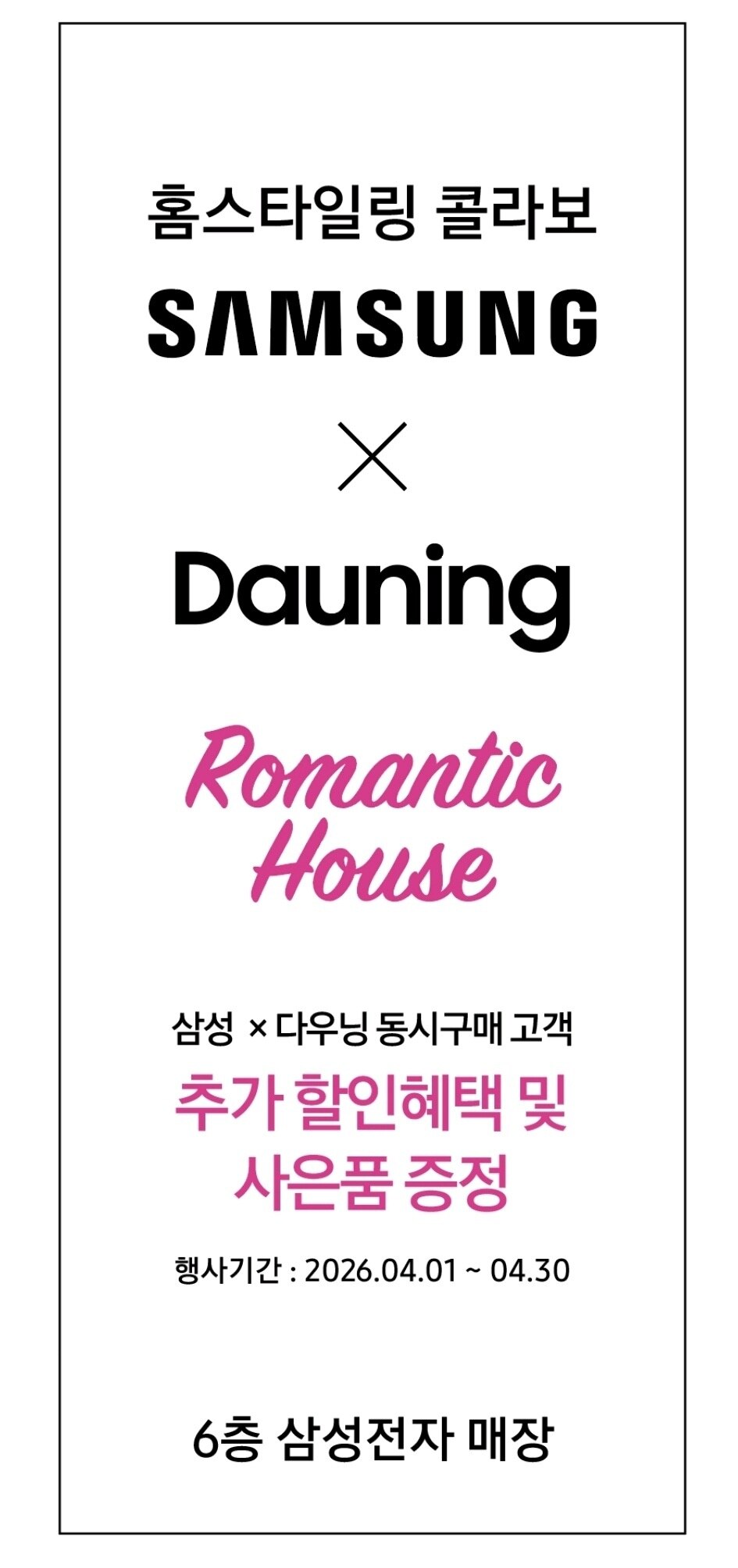 삼성전자와 다우닝이 제안하는 새로운 공간. 삼성전자 매장에 전시된 다우닝 제품 구매 시 특별한 혜택을 함께 드립니다.
